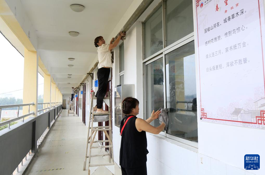 8月25日,工作人員在河南省洛陽市汝陽縣直屬初級中學進行校園衛生清理。(新華社發 康紅軍/攝)