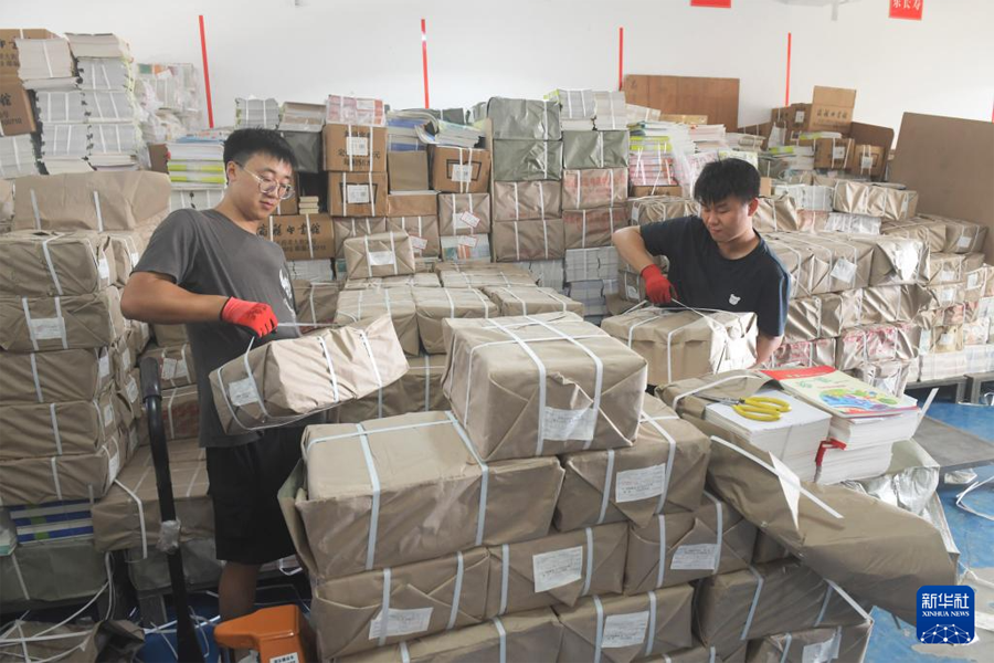 8月25日,在河南省沁陽市新華書店教材倉庫,工作人員在配發新學期教材。(新華社發 楊帆/攝)