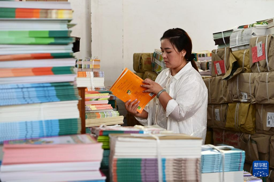 8月25日,工作人員在河北新樂市新華書店倉庫整理清點中小學教材,準備送往各學校。(新華社發 賈敏杰/攝)