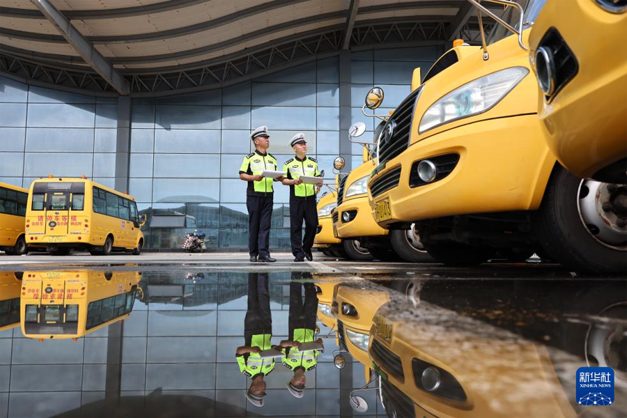8月25日,江蘇省淮安市公安局洪澤分局交警大隊民警對校車進行安全檢查。(新華社發 殷潮/攝)