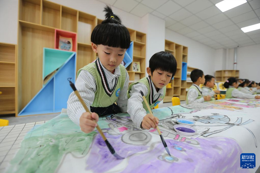 9月28日,甘肅省定西市安定區幼兒園的小朋友在繪制《我愛你中國》長卷。(新華社發 王克賢/攝)