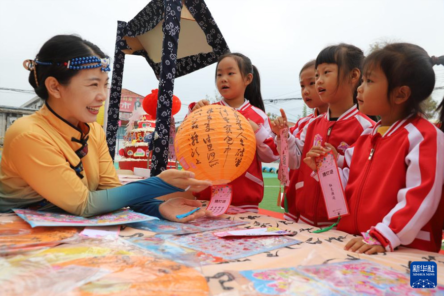 9月28日,在山東省濱州市沾化區馮家鎮李家幼兒園,孩子們在“拾趣品中秋 童心迎國慶”活動上猜燈謎。(新華社發 賈海寧/攝)