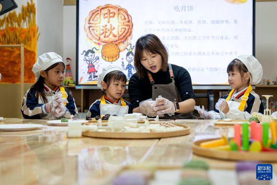 9月29日,在河南省商丘市睢縣古襄路幼兒園,小朋友們在老師的講解下學習制作冰皮月餅,了解中秋習俗。(新華社發 徐澤源/攝)