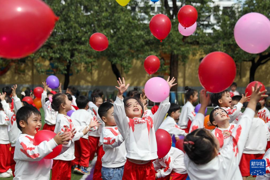 9月29日,河南省平頂山市寶豐縣鬧店鎮中心幼兒園的孩子們在放飛氣球。(新華社發 何五昌/攝)