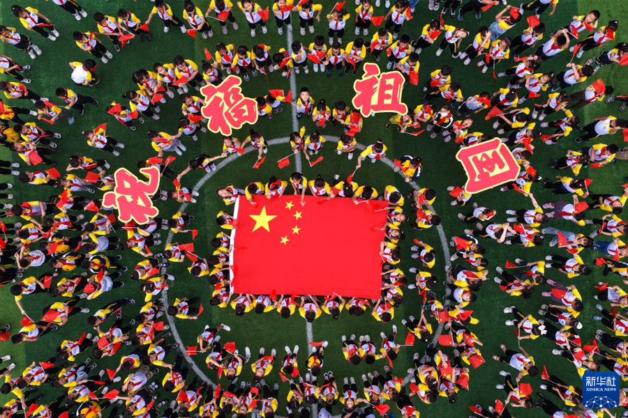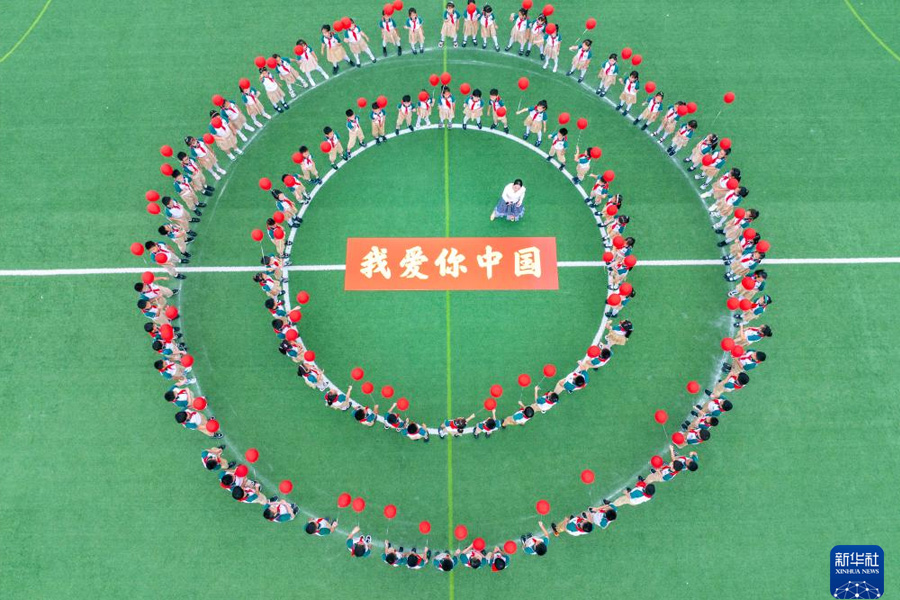 9月28日,江蘇省泰州市姜堰區東橋小學教育集團東板橋校區學生學唱愛國歌曲,迎接國慶節(無人機照片)。(新華社發 周社根/攝)