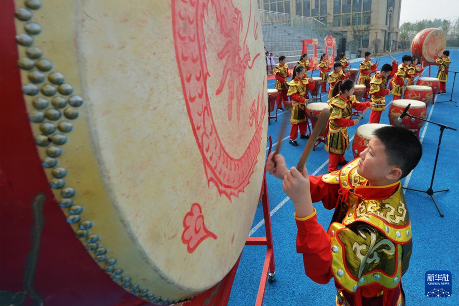 9月29日,在山東青島啟潤實驗學校舉行的迎國慶主題活動中,學生表演鼓舞。(新華社發 王海濱/攝)
