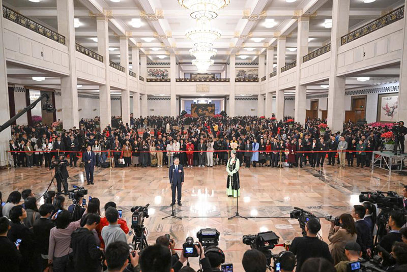 3月11日,第十四屆全國人民代表大會第三次會議第三場“代表通道”集中采訪活動在北京人民大會堂舉行。這是接受采訪的全國人大代表入場。(新華社記者 胥冰潔/攝)