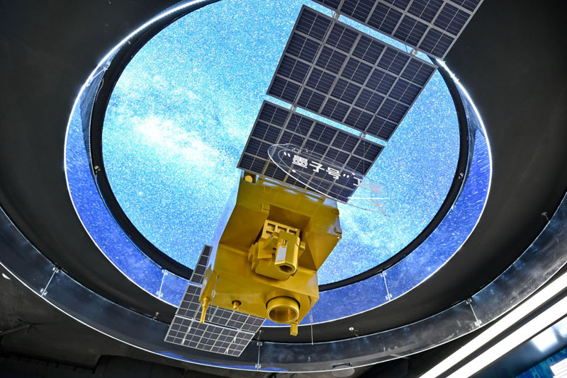 ??在位于安徽省合肥市的中電信量子信息科技集團有限公司科技體驗館內拍攝的“墨子號”量子衛星模型(2025年7月1日攝)。(新華社記者 張鋮/攝)