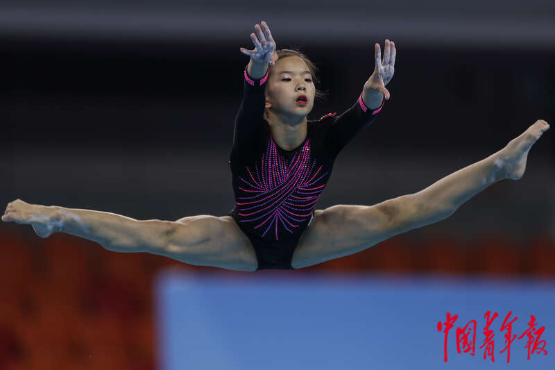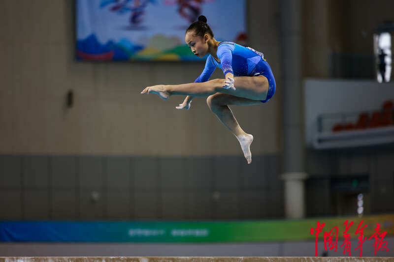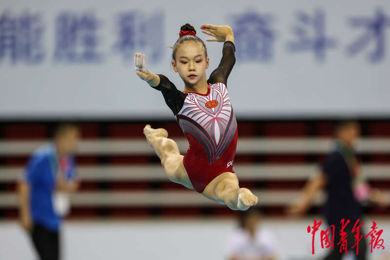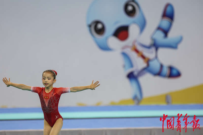 11月9日,廣西南寧,學青會體操比賽女子乙組團體決賽,深圳市隊11歲選手張雅涵在自由體操比賽中。(中青報·中青網記者 曲俊燕/攝)