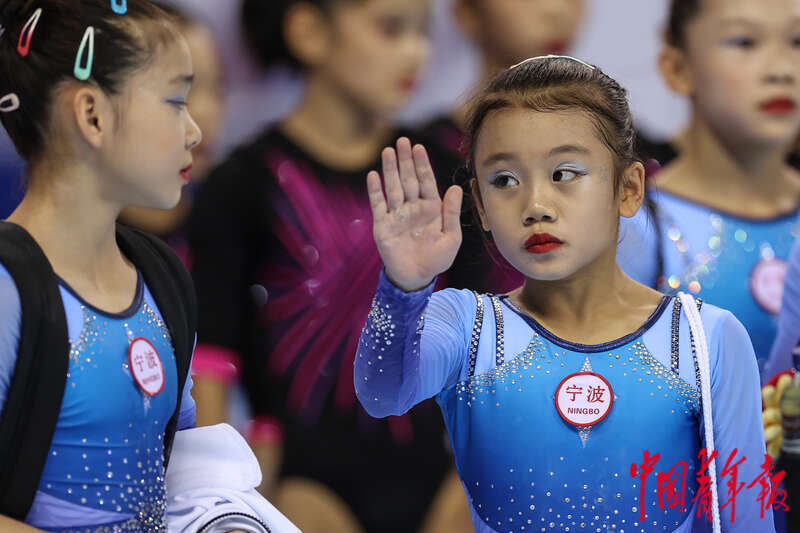 11月9日,廣西南寧,學青會體操比賽女子乙組團體決賽,上海市黃浦區11歲選手曾健安在賽前進行熱身訓練。(中青報·中青網記者 曲俊燕/攝)