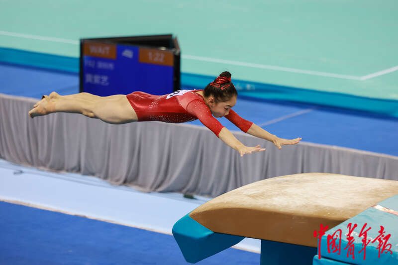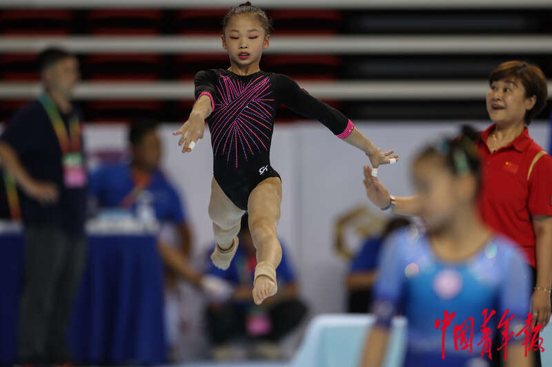 11月9日,廣西南寧,學青會體操比賽女子乙組團體決賽,福建省福州市11歲選手曾一凡在跳馬比賽中。(中青報·中青網記者 曲俊燕/攝)