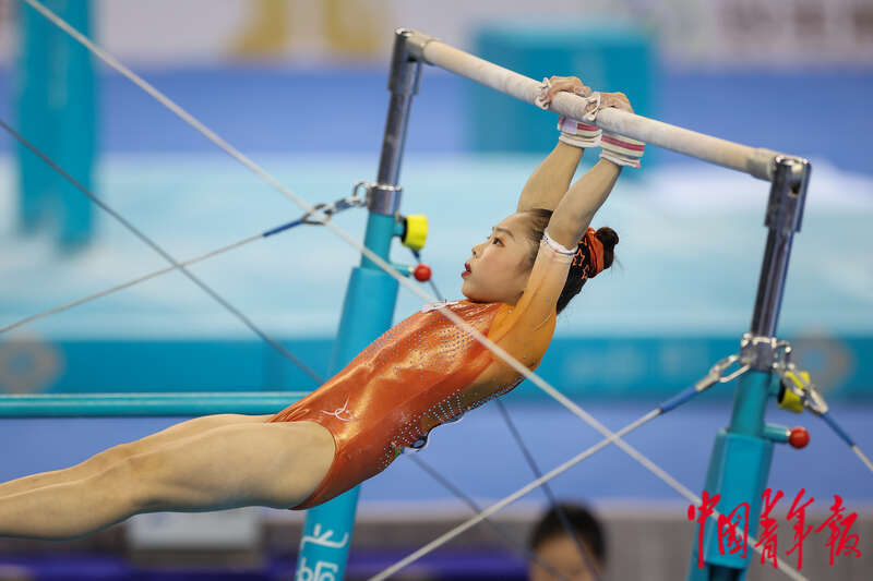 11月9日,廣西南寧,學青會體操比賽女子乙組團體決賽,湖北省宜昌市11歲選手張佳樺在高低杠比賽中。(中青報·中青網記者 曲俊燕/攝)