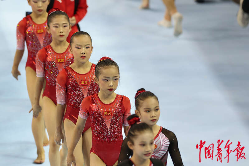 11月9日,廣西南寧,學青會體操比賽女子乙組團體決賽,選手們列隊轉移場地,輪換比賽項目。(中青報·中青網記者 曲俊燕/攝)
