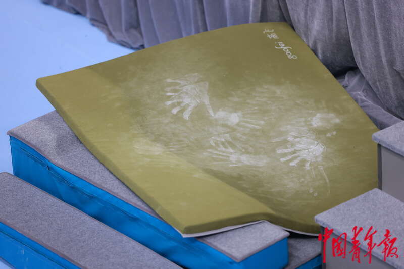 11月9日,廣西南寧,學青會體操比賽女子乙組團體決賽,現場的一張墊子上留下選手們訓練的痕跡。(中青報·中青網記者 曲俊燕/攝)