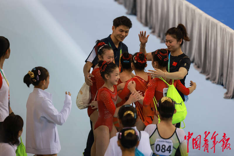 11月9日,廣西南寧,學青會體操比賽女子乙組團體決賽,得知獲得第三名的福建省福州隊隊員與教練員互相擁抱慶祝。(中青報·中青網記者 曲俊燕/攝)