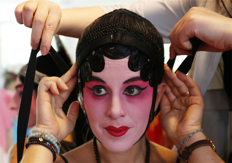 2023年9月9日,在法國巴黎中國文化中心,法國觀眾體驗昆曲旦角扮相。(新華社記者 高靜/攝)