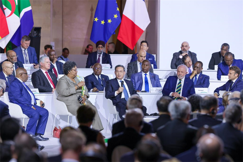 2023年6月23日上午,國務院總理李強在巴黎出席新全球融資契約峰會閉幕式并發表講話。(新華社記者 劉彬/攝)